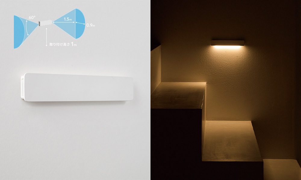 本体の左右にそれぞれセンサーが内蔵されており、両側から人の動きを感知し点灯します。