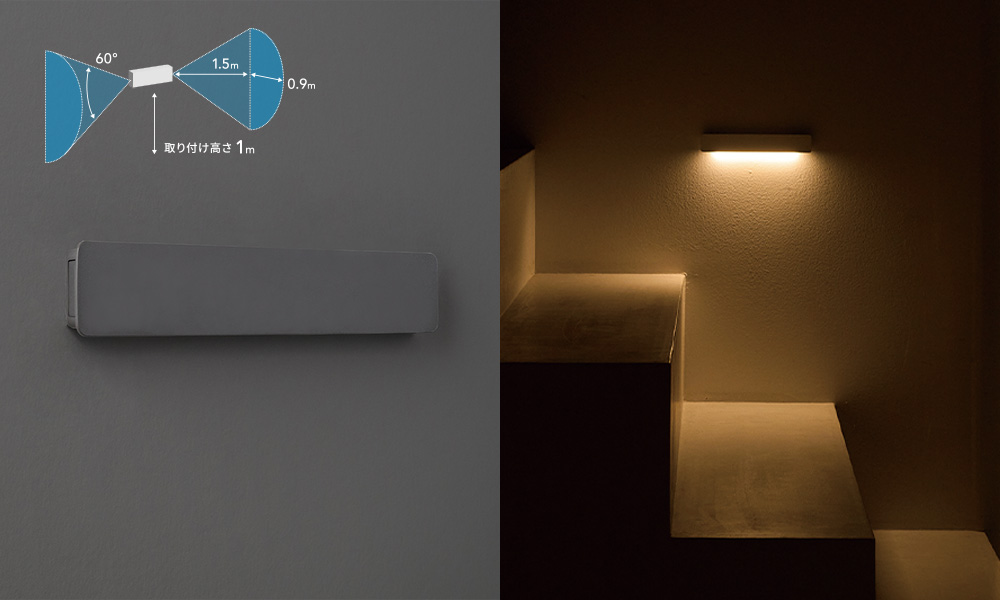 本体の左右にそれぞれセンサーが内蔵されており、両側から人の動きを感知し点灯します。