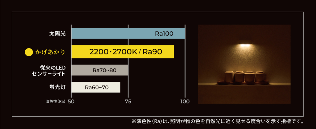 照明設計士の監修により、配光・色温度・演色性をつきつめ、従来のセンサーライトにはない、陰影を活かす美しい「あかり」を実現しました。