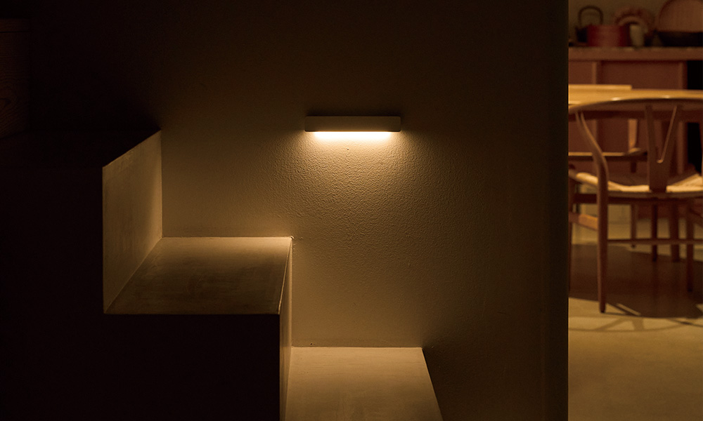 「かげあかり」は、光の質と陰影にこだわり、あかり本来の美しさを追求した屋内用センサーライトです。点灯していない時も空間に溶け込み、どんなインテリアにも調和する造形が高く評価されました。廉価帯の照明器具において、器具そのものではなく“光”をデザインの主題とした点が、「かげあかり」と従来品・競合品との最大の違いです。光と陰影を引き立てるため、存在感を極力抑え、壁面と一体化するよう設計。センサー部分は前面から見えない位置に配置するか、ボディと同色化・フラット化を徹底することで、形の主張を限りなくゼロに近づけました。